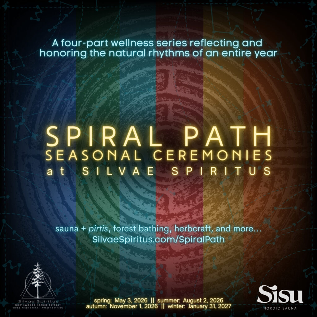 Spiral Path: Seasonal Ceremonies, co-created by Silvae Spiritus and Sisu Nordic Sauna, is a four-part wellness series reflecting and honoring the natural rhythms of an entire year.  Each session building upon the last, each season meeting us where we authentically are.   Through sauna, cold plunge, and the mind, body, and spirit-tending Latvian thermic ritual of pirtis; deeply connective Forest Bathing and mytho-poetic herbcraft through the lens of animism; meditative and intuitive journaling; and the practice of community connection via The Way of the Circle, each gathering will focus on the profound wisdom and expansive teachings of a season and those most connected to it.
